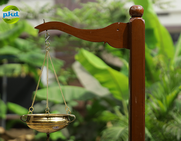 A six-foot decorative wooden stand designed for Shirodhara or Dhara therapy comes with a choice of three different vessels made of white bronze, copper, or wood. The stand has four legs for stability.